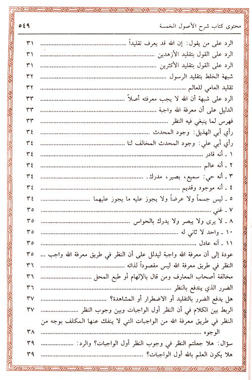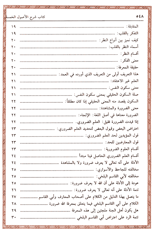وهكذا يميز القاضي في بحوث العقائديين نوعين من الناس: العامة وهؤلاء لا يكلفون إلا بالمعرفة الإجمالية من أصول، والعلماء وهؤلاء وحدهم الذين يحق لهم البحث التفصيلي فيها فالمعرفة الإجمالية إذن كافية لترتيب التكليف على المكلفين، أو بعبارة أخرى إن المكلف لا يجب عليه أكثر من المعرفة الإجمالية. ثم يعرض للأصول الخمسة عرضاً سريعاً يتناسب مع هذه الفكرة مبيناً ما يجب على المكلف معرفته من كل أصول من الأصول الخمسة: التوحيد، والعدل، والوعد والوعيد، والمنزلة بين المنزلتين، والأمر بالمعروف والنهي عن المنكر. ويعود بعد ذلك إلى تفصيل ما أجمله من أصول ويختم الكتاب بفصل في التوبة تيمناً وتبركاً وتفاؤلاً بالكثير والقبول , وتمتاز عبارة هذا الكتاب بالوضوح والسهولة، على عكس عبارة "المغني" ولعل ذلك لأنه أملاه بعد بدئه في "المغني"، وكان يلقيه في دروس يحضرها العامة والخاصة، فأراد أن يبسط قواعد الاعتزال وييسر تناولها ونشرها. وتبدو قيمة هذا الشرح في أنه يحيط بأغلب المسائل الاعتقادية التي كانت مدار البحث بين الكلاميين على اختلاف مشاربهم من معتزلة وأشعرية وكرامية ومجبرة إلى غيرهم.