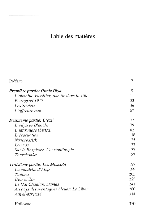 A travers un long periple dans l’espace et le temps, l’auteur, Irene Lehr, elle-meme nee sur les chemins de l’exil, nous entraine, de Saint-etersbourg a Aine el-Mresisse, dans un voyage fantastique et pourtant bien reel en Russie d’abord, a Constantinople, Alep, Damas et Beyrouth enfin.