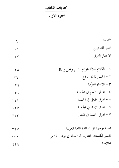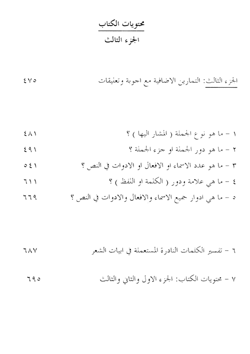 والكتاب يتضمن مئة جملة منقولة عن القرآن الكريم وست مئة بيت من عيون الشعر العربي، ويتحاشى استعمال التعبير غير الواضحة مثل: مبتدأ وخبر، مضاف ومضاف إليه، نائب فاعل، أفعل التفضيل-وغير ذلك"، وتستعمل مكانها تعابير مثل: اسم أساسي واسم متمم واسم متبوع واسم تابع وغير ذلك. والكتاب عموماً يتوجه إلى جميع الطلاب والمحترفين. ويتضمن الجزء الثاني التمارين مع أجوبة وتعليقات أما الجزء الثالث فيتضمن تمارين إضافية مع أجوبة وتعليقات. إقرأ المزيد