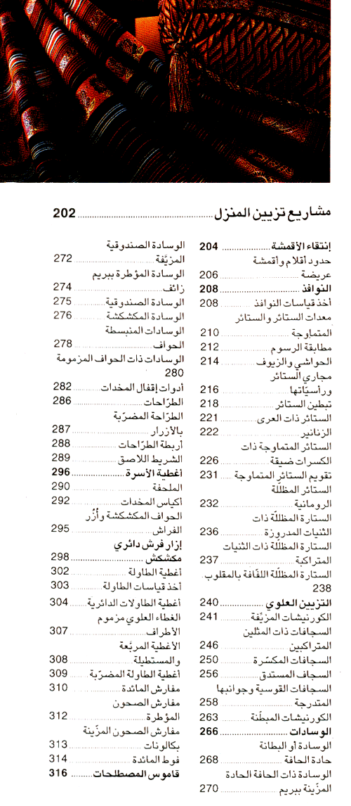 أما القسم الثاني من الكتاب فيقدن شروحات مستفيضة خاصة بمشاريع تزيين المنزل، بدءاً بستائر النوافذ فأوجه الوسادات بمشاريع تزيين المنزل، بدءاً بستائر النوافذ، فأوجه الوسادات فأغطية الطاولات والأسرة والستائر هذا وتضفي الصور الفوتوغرافية الملونة والمتناثرة بين الصفحات عمقاً وبعداً دقيقين وذلك لتوفيرها نظرة دقيقة عن قرب لكل مرحلة من مراحل الشرح والتدقيق العملي للخياطة وهذه الصور يأخذ بيد السيدة خطوة خطوة وتعلمها دقائق مهام التفصيل والدرز لقد صمم هذا الكتاب ليكون للسيدة معيناً وملهماً سواءً كانت خياطة مبتدئة أم متمرسة في المهنة.نبذة الناشر:سواء كنت مبتدئة أو متمرّسة، سوف تكون هذه الموسوعة المصوّرة الشاملة للخياطة المرجع الذي تعودين إليه مراراً وتكراراً. وسوف تجدين إجابات عن كلّ الأسئلة المتعلقة بخياطة الملابس والخياطة للمنازل.