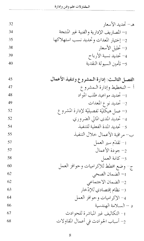 لقد أصبح التخطيط المدروس قبل مباشرة أي عمل إلزامياً ولم يعد الاعتماد على المغامرة والمقامرة ممكناً. والمقاولة أولاً وأخيراً علم وفن إدارة. يقدم لك هذا الكتاب المعلومات الضرورية والأساليب العلمية الحديثة التي تمكنك من النجاح في عملك كمقاول وهو يتضمن خمسة فصول يبين الفصل الأول أنواع المقاولات الثلاث (مقاولة الكلفة المقطوعة الثابتة، مقاولة تسعير الوحدات ومقاولة الكلفة الحقيقية مضافاً غليها أجور ثابتة). أما الفصل الثاني فهو توضيح لعملية الاشتراك في المناقصة ودراسة الأسعار وتحليلهما وكيفية تحديد نسبة الأرباح وتأمين السيولة النقدية. في حين يعرض الفصل الثالث للإدارة المشروع وتنفيذ الأعمال بدءاً من التخطيط ومراقبة الأعمال وفي الفصل الرابع يعرض المؤلف واجبات المقاول وحقوقه ويختم في الفصل الخامس كتابه وأرفق الكتاب بدفتر الشروط والأحكام العامة الذي يطبق في كل صفقات الأشغال العامة الصادرة عن وزارة الأشغال في الجمهورية اللبنانية. إقرأ المزيد