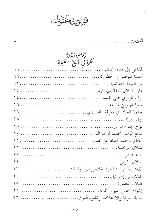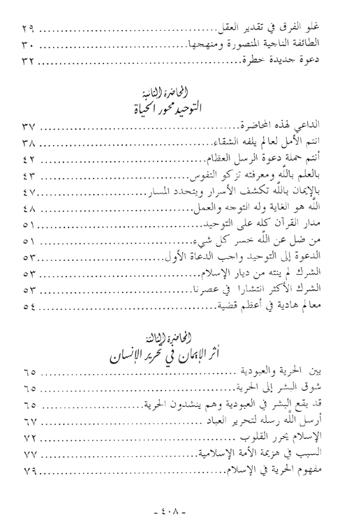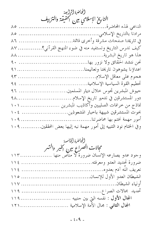 وقد بين المؤلف في محاضرة أخرى القضية الكبرى التي ينبغي أن تكون مدار حياة الفرد المسلم والمجتمع المسلم، ألا وهي توحيد الله -تبارك وتعالى- وتطرق أيضاً إلى التاريخ الإسلامي ويعرض لدور المستشرقين التخريبي. وفي مجال آخر ناقش موضوع الصراع بين الخير والشر وبين مجالات الصراع أو دوائر الصراع بين الخير والشر في حياة المسلم فيؤكد أن المجال العالمي هو أوسع هذه الميادين وأكثرها كلفة وأبعدها خطراً.