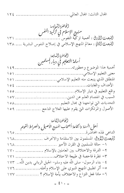 وفي معرض بحثه في منهج الإسلام في تزكية النفس، يتحدث عن تفرد المنهج الإسلامي في مجال التزكية، ويشير إلى معالم المنهج الإسلامي الذي يزكي النفوس ويصلحها. كما يعرض لموضوع خطير جداً وهو أسلمة التعليم في ديار المسلمين، فيدعو إلى إعادة التعليم إلى خطيرة الإسلام بعد أن أبعد عنها دهرا طويلاً. ويبين في محاضرة أخرى أن أهل السنة والجماعة أصحاب المنهج الأصيل والصراط القومي، وقد حاول أثناء ذلك أن يكشف عن المنهج الأصيل الذي يمثل الحق في هذه الأمة وهو منهج أهل السنة والجماعة ويكشف عن أصوله وخصائصه. وسعياً في أن يتبين كيف تستعيد الأمة مكانتها من جديد فيسلط الضوء على المكانة الفضلى التي استحقتها هذه الأمة والسر في استحقاقها لها.