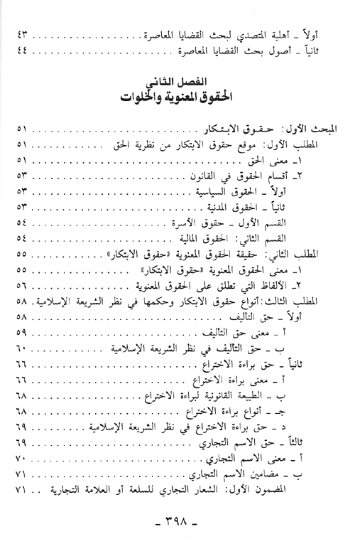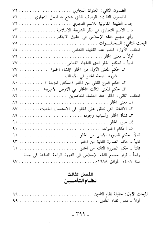 وقد قسمت هذا الكتاب إلى مقدمة وخمسة فصول وخاتمة: تكلمت في المقدمة عن منهجي في إعداد هذا الكتاب. وتكلمت في الفصل الأول عن منهجية التعامل مع المعاملات المالية المعاصرة. فبينت فيه خصائص المعاملات في الفقه الإسلامي، والمراد بالمعاملات المالية المعاصرة ومنهج البحث فيها. وتكلمت في الفصل الثاني، عن الحقوق المعنوية كحق التأليف وحق براءة الاختراع وحق الاسم التجاري، ثم بينت في هذا الفصل أحكام الخلوات. وتكلمت في الفصل الثالث عن نظام التأمين والبديل الشرعي له.