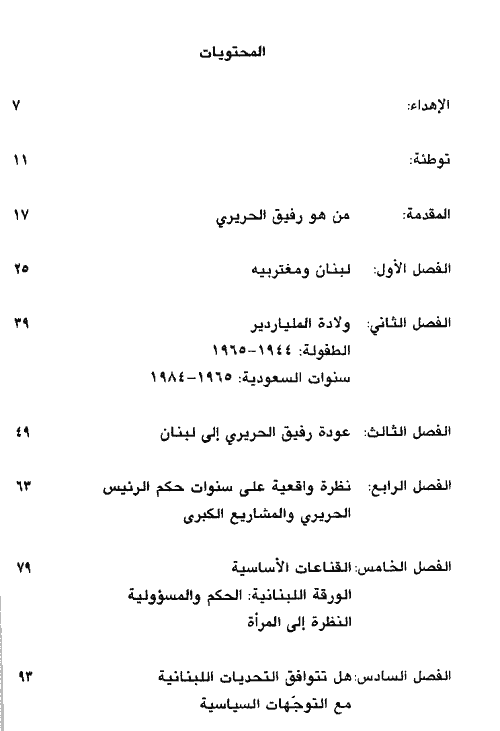يتناول هذا الكتاب سيرة الرئيس رفيق الحريري منذ هجرته المبكرة إلى المملكة العربية السعودية، وصولاً إلى انخراطه في العمل الساسي في لبنان، كما يتناول الركائز الأساسية لتصوره السياسي العام، رهانه على السلام في الشرق الأوسط، علاقاته مع باقي الزعماء السياسيين في لبنان والعالم.