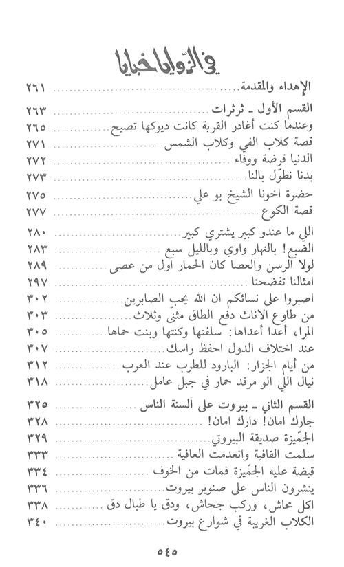 نبذة نيل وفرات:قد يكون هناك أدب خاص بالنخبة من الناس تعبر به عن مفاهيمها في الحياة وتذهب به مذاهب شتى في التسميات. وقد يكون هناك أدب خاص بالعامة من الناس وهو يتمثل بالحكايات والأمثال والخرافات والأساطير والأغاني والأزجال ويعرف باسم الأدب الشعبي. ولكن ما دامت هنالك أفكار وعواطف وهموم واعتبارات مشتركة ...عند جميع الناس، فلماذا لا يكون هناك إذاً "أدب ناس لجميع الناس". تحت هذا العنوان يمكن تصنيف مضمون الأعمال الكاملة لسلام الراسي وهي عبارة عن أربعة مجلدات الأول منها ضمّ مجموعة من القصص الشعبية الواقعية جمعها الكاتب عن ألسنة الناس واختار عنواناً لها وهو "لئلا تضيع-في الزوايا خبايا". وضمّ المجلد الثاني مجموعة من الأقوال التي يستعملها العامة من الناس في أحاديثهم وهي عبارة عن كلام يعبق بجمال الفكر والحكمة والأدب وجاء المجلد تحت عنوان "حكي قرايا وحكي سرايا-شيح بريح". وأما المجلد الثالث فقد ضمّ حكايات حقيقية، وأساطير وخرافات مجدّدة وخبريات وأحاديث على المصاطب وفي الدواوين، وهي من مأثورات التراث اللبناني العشبي وقد حاول الكاتب جهده أن يقرن في كتاباته الجدّ بالدعابة والحكمة بالبساطة متوخياً أسهل السبل إلى ذهن القارئ. وجاء المجلد الثالث تحت عنوان: "الناس بالناس-حيص بيص". وأما المجلد الرابع فقد ضمّ مجموعة من الأشعار والأزجال والحكم والأمثال وذلك في إطار حكايات محكية ومكتوبة بقوالب الأدب الشعبي. وجاء تحت عنوان "الحبل على الجرار-جود من الموجود". ويمكن القول بأن تلك الأعمال ما هي إلا حصيلة جهد سلام الراسي في عمل دؤوب هدفه الحفاظ على ذاكرة وتراث الأدب الشعبي اللبناني، ذاك الحرص جعل من الكاتب علماً من أعلام هذا الفن الأدبي من جهة، ورجل حفظ لأمته جزءاً هاماً من تراثها الذي كاد أن يضيع. إقرأ المزيد