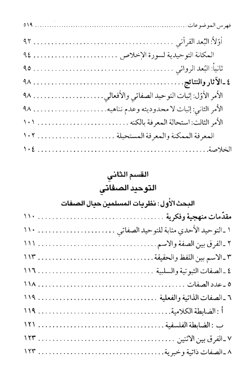 لو أخذنا مثلاً بحث العلم الإلهي من الكتاب الأول وقارنا بتقسيماته وفصوله مع أطول بحث في الكتاب الثاني تناول نظرية الأمر بين الأمرين، للمسنا أن المسلم برغم أنه فاقه بالحجم. هذه الفاعلية تتحول مع بحث "القضاء والقدر" ثاني أطول بحث في الكتاب الثاني، إلى حيوية تتفجر في صميم الموضوع على أطرافه لتمنحه المزيد من الجاذبية، خاصة بعد أن انتقلت المعالجة إلى الجانب الاجتماعي يرتبط به من قضايا مثيرة تلامس أبرز مسألة في واقع المسلمين المعاصر، مسألة النهضة والتقدم. الكلام نفسه ينطبق على بحث الشرور والعرش والكرسي ومظاهر الاسم الأعظم حتى الصفات السلبية ونفي الرؤية، إذ كانت الإيقاعات الإيمانية الدافئة تتقدم على صرامة البحث النظري وتسبقها إلى النفوس، وهي تنبثق من ثنايا الممارسة الفكرية وتطلع من وسط الدليل، بحيث يتجاوب العقل والإيمان معاً. تبقى الإشارة إلى أن الكتاب بجزأيه تعي أميناً على منهجية مرتكزة على عمق الفكرة ووضوح الأسلوب التعبيري، وعلى صياغة واضحة مؤدية للأفكار والمعاني دون غموض وتعقيد، كما روعي توزيع المحتوى على هيكل اجتهد أن يأتي مترابطاً، وأيضاً اختيار عناوين دالة وذلك بغاية الحصول على مزيد من التيسير والإيضاح. إقرأ المزيد