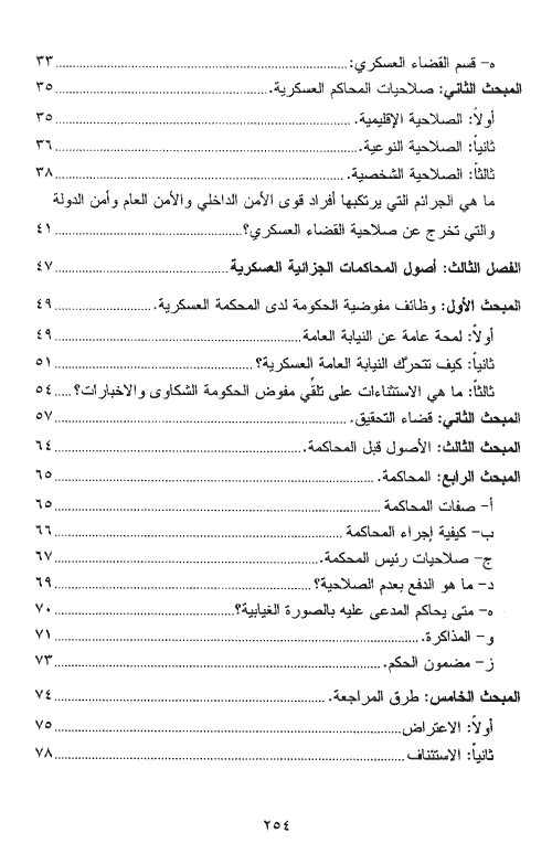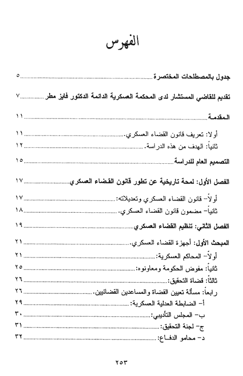 ثم تطرق بعد هذه المقدمة إلى لمحة تاريخية عن تطور القضاء العسكري، وإلى تنظيم القضاء العسكري مبيناً أجهزته وصلاحيات المحاكم العسكرية وبأنواعها الصلاحية الإقليمية، الصلاحية النوعية والصلاحية الشخصية والحالات التي يحاكم فيها رجال قوى الأمن الداخلي والأمن العام وأمن الدولة والجمارك أمام المحاكم العسكرية. ويبحث المؤلف أصول المحاكمات الجزائية العسكرية فيتحدث عن وظائف مفوض الحكومة لدى المحكمة العسكرية مبيناً كيفية ترك النيابة العامة وعن قضاء التحقيق، والأصول قبل المحاكمة والدفوع التي يمكن الإدلاء بها (الدفوع الشكلية) قبل أي بحث في أساس الدعوى وعن طريق المراجعة (الاعتراض والاستئناف والنقض) وعن إعادة المحاكمة وإعادة الاعتبار وكيفية تنفيذ الأحكام.
