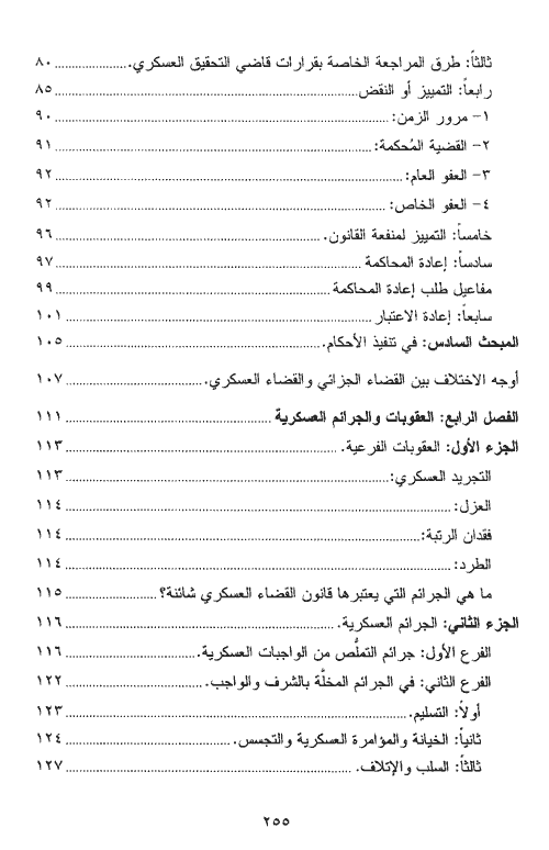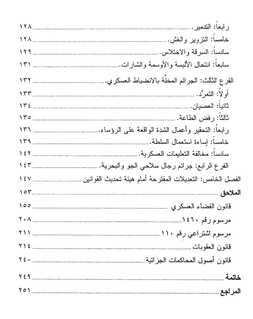 ولا يغفل الكاتب قبل الانتقال إلى الجرائم العسكرية دراسة أوجه الاختلاف بين القضاء الجزائي والقضاء العسكري ويتطرق الكاتب أيضاً إلى العقوبات والجرائم العسكرية فيبين العقوبات الفرعية والجرائم العسكرية كجرائم التملص من الواجبات العسكرية، والجرائم المخلة بالشرف والواجب كالتسليم والمؤامرة العسكرية والتجسس والسلب والإتلاف والتدمير والغش والسرقة والاختلاس وانتحال الألبسة والأوسمة والشارات، والجرائم المخلة بالانضباط العسكري كالتمرد والعصيان ورفض الطاعة والتحقير وأعمال الشدة الواقعة على الرؤساء وإساءة استعمال السلطة ومخالفة التعليمات العسكرية وجرائم رجال سلاحي الجو والبحرية، وأخيراً يبين المؤلف التعديلات المقترحة على قانون القضاء العسكري أمام هيئة تحديث القوانين. إقرأ المزيد