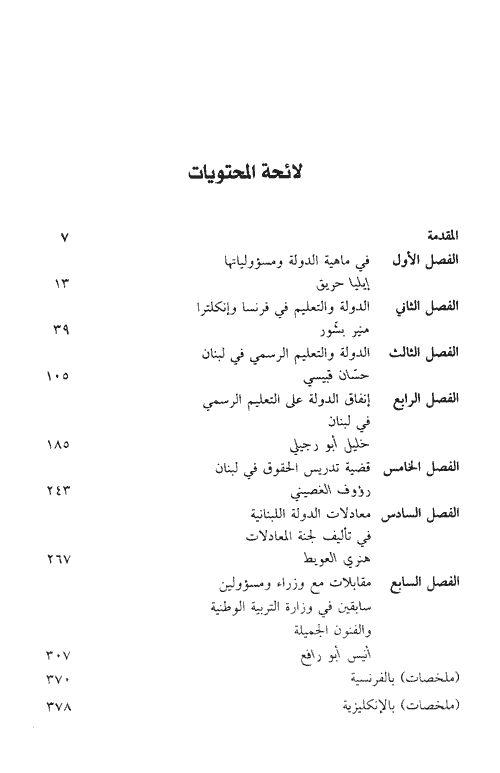 أما منير بشور فيرى في الفصل الثاني أن مسؤولية الدولة في مجال التعليم فرع من أصل، يمكن اختصاره بالسؤال التالي: لمن يعود حق اتخاذ القرار بالنسبة لتعليم الأولاد. وفي الفصل الثالث يتناول حسان قبيسي موضوع الدولة والتعليم الرسمي في لبنان فيدخل في مراجعة تاريخية وسياسية واجتماعية سهبة ليستنتج أن مصير المدرسة الرسمية في لبنان رهن بتغيير السلطة السياسية والواقع السياسي.