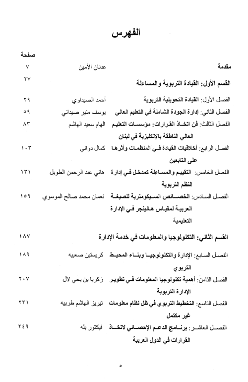 كما تعرض لنقاط الضعف في المنهج التربوي اللبناني الجديد كما تناول دور الحاسوب في عملية صنع القرار ويهدف الفصل الثمن إلى الكشف عن أهمية تكنولوجيا المعلومات في مجال الإدارة التربوية من وجهة نظر أعضاء هيئة التدريس بالجامعات السعودية وفقاً لمتغيري التخصص والجنس. أما الفصل التاسع فيهدف إلى فحص ما تقدمه الإدارات التربوية في الدول العربية من معلومات وإحصاءات لا بد منها في وضع الخطط التربوية ومتابعتها وتقييمها.