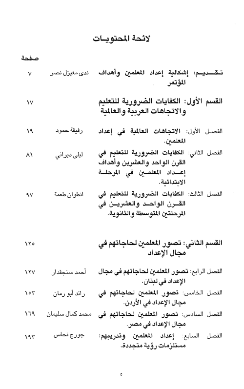 وعلى ضوء هذا انعقد مؤتمر الهيئة اللبنانية للعلوم التربوية الذي عقد في بيروت في 9-10 تشرين الثاني 2001. وتضمن عدة محاور يضمها هذا الكتاب. المحور الأول يدور حول الكفايات الضرورية للتعليم والاتجاهات العربية والعالمية. ففي الفصل الأول عالجت رفيقة حمود الدور الأساسي الذي يلعبه التعليم في إعداد رأس المال البشري آخذة بعين الاعتبار العوامل العديدة التي تؤثر على مدى فاعلية هذا الإعداد.