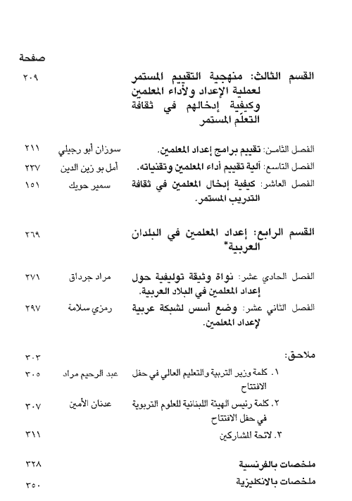 كما تعرض للمبادئ التي يمكن اعتمادها والخطوات المتبعة والأدوات المستخدمة من أجل تطبيقه وفي الفصل العاشر يتوقف سمير خليل الحويك عند مسألة ثقافة التدريب المستمر للمعلمين فتبدأ بتحديد ماهية التدريب المستمر معددة تصنيفاته. أما المحور الرابع فيدور حول إعداد المعلمين في البدلان العربية، إذ يعرض مراد جرداق نواة وثيقة توليفية حول إعداد المعلمين في البلاد العربية أما رمزي سلامة فيضع في الفصل الثاني عشر أسس شبكة عربية لإعداد المعلمين وهي عبارة عن عناوين أفكار وضعها للنقاش في مؤتمر إعداد المعلمين. إقرأ المزيد