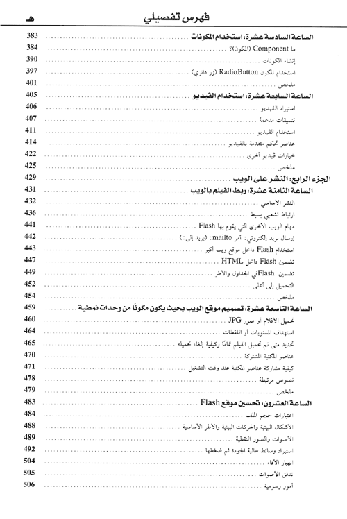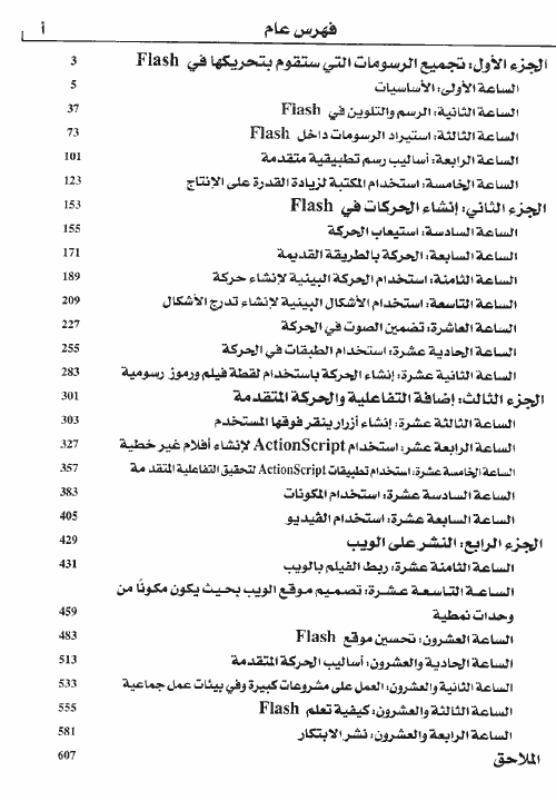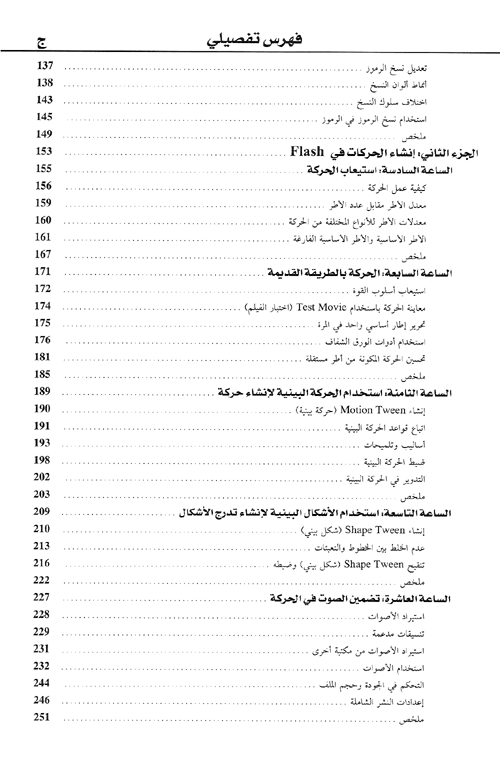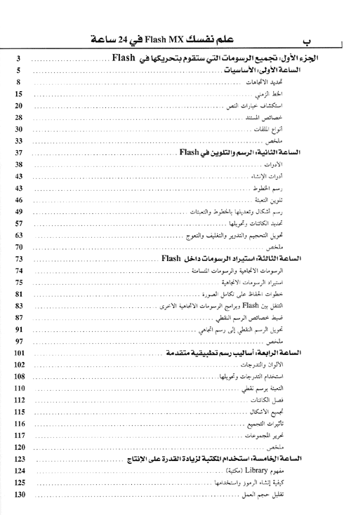 يقع الكتاب في أربعة أجزاء، ويقدم الجزء الأول بعض المعارف الأساسية التي تتعلق بخطوات التدريب على فلاش كما تعرف بتقنيات الرسم والتلوين واستمرار الرسومات داخل Flash، وأساليب رسم تطبيقية متقدمة إضافة إلى استخدام المكتبة لزيادة القدرة على الإنتاج. وفي الجزء الثاني يتعرف المتدرب إلى بعض المفاهيم التي تتناول الحركة بشكل عام، وتطبيقاتها في Flash، إضافة إلى اكتساب المهارات الفنية للحركة وكيفية عمل الحركة.إضافة إلى تعلم إنشاء حركة في كل إطار، وصولاً إلى الحركة والأشكال البينية.