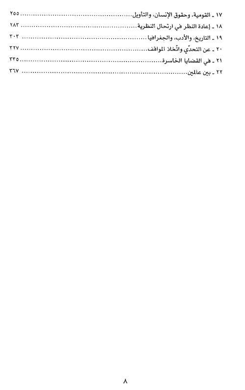 وهذه المنطقة ذاتها هي منطقة "المنفى" كما يفهمه إدوارد سعيد، وكما يريد له أن يفهم، فالمنفى عنده لا يقتصر على ما تشير إليه الكلمة لأول وهلة من بعد، وفصل وانزياح وانقطاع، بل يفترض عدم الانقطاع الكامل، وضرباً من الاختلاط بين الانقطاع والارتباط، وعيشاً في العالم الواحد الذي يجمعنا على الرغم من خصوصياتنا التي ينبغي ألا تتحول إلى أصنام نعبدها.نبذة الناشر:إن هذه الباقة من الأبحاث الأدبية والثقافية التي طالما انتظرناها من البروفيسور إدوارد سعيد تعيد تأكيد ما ليس فيه أدنى شك، ألا وهو كون سعيد الناقد الأكثر تأثيراً وتألقاً في زمننا هذا. وتقدم هذه المجموعة إثباتاً اكبر على مدى مساهمة العقل النقدي الملتزم في مخزون القيم والأفكار والأفعال الأساسية في حياتنا.