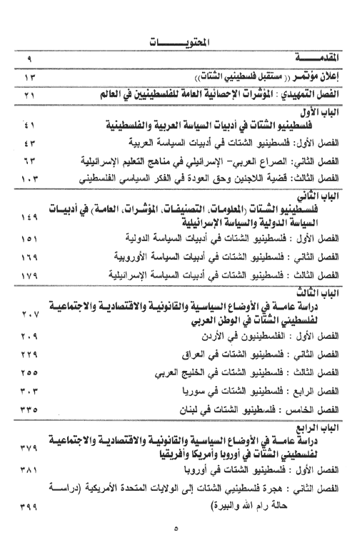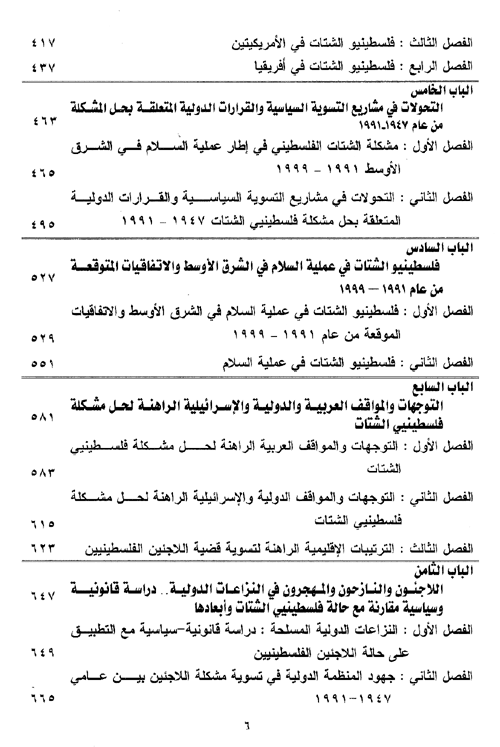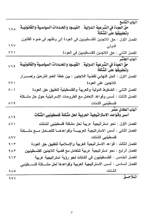ثم ينتقل الحديث في الباب الخامس ليناقش التحولات في مشاريع التسوية السياسية والقرارات الدولية المتعلقة بحل المشكلة الشتات الفلسطيني من عام 1947-1991، فيأتي الفصل الأول لدراسة أوضاع فلسطينيو الشتات في عملية السلام في الشرق الأوسط والاتفاقيات الموقعة من عام 1991 – 1999، في حين يناقش الفصل الثاني التحولات في مشاريع التسوية السياسية والقرارات الدولية المتعلقة بحل المشكلة بين عامي 1947 – 1991، ويستكمل الباب السادس الحديث حول التسوية السياسية للمشكلة من خلال الحديث عن فلسطينيي الشتات في عملية السلام في الشرق الأوسط والاتفاقيات المتوقعة من عام 1991 – 1999، حيث الحديث في الفصل الأول عن فلسطينيي الشتات في عملية السلام في الشرق الأوسط والاتفاقيات الموقعة من عام 1991 – 1999، فيما يناقش الفصل الثاني أوضاع فلسطينيي الشتات في عملية السلام. ثم ينتقل الحديث في الباب السابع عن التوجهات والمواقف العربية والدولية والإسرائيلية الراهنة لحل مشكلة فلسطينيي الشتات، فيظهر التركيز في الفصل الأول عن التوجهات والمواقف العربية الراهنة لحل مشكلة فلسطينيي الشتات، فيما ينتقل الحديث في الفصل الثاني لدراسة التوجهات والمواقف الدولية والإسرائيلية الراهنة لحل مشكلة فلسطينيي الشتات، فيما يركز الفصل الثالث على الترتيبات الإقليمية الراهنة لتسوية قضية اللاجئين الفلسطينيين.