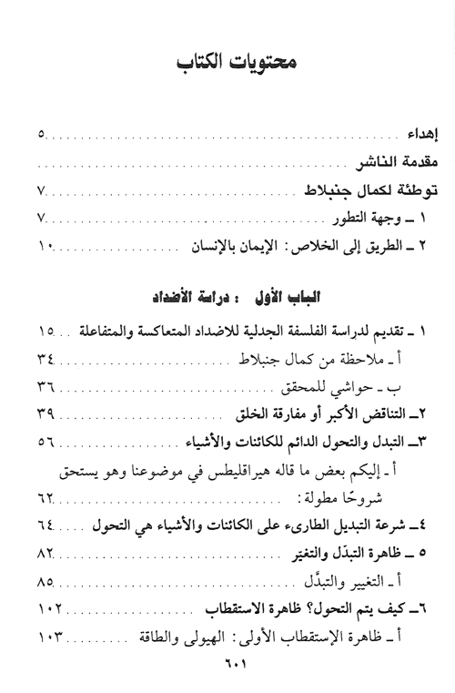كما إنه متواصل في إمتداد أصيل وتفرّع حلزوني متصل ...وشمول كلي عميق من المادة التي تدخنت وتبخرت إثر تجزئتها التروية وإنطلاقاً من فهم المعلم كمال جنبلاط اما يفرضه الإيمان بالإنسان عبر في مؤلفه عن رؤى عميقة، تبلورت عبر تجربة شخصية كابدها خلال سنوات حياته الغنية بالعطاء والمعرفة وقد جاء مؤلفه في أبواب خمسة، تصدى فيها لبحث موضوع الجدلية وطبيعة الحياة وحقائقها.