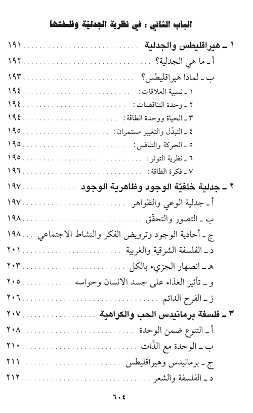 ويبحث في الباب الثاني نظرية الجدلية وفلسفتها حيث يرى أن العمل الجدلي متواصل منذ بداية التاريخ لتطهير الفكر والواقع والجدلية بالنهاية هي ترك جميع ما توقف عنده فكرنا من مقامات تقليدية. كما أفرد الباب الثالث البحث في جدلية السعادة، وهو يتكمل ما بدأه في الصفحات السابقة ليبحث في لون آخر مما يجب أن نعرفه عن التفكير الجدلي ولكن في نطاق ما يسميه الظاهرة الجدلية أو ظاهرية السعادة.