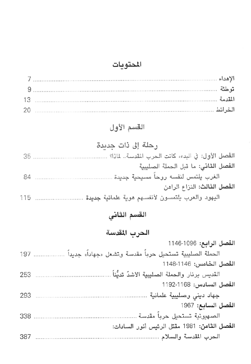 نبذة الناشر:في سنة 1095، دعا البابا أوربان الثاني المحاربين المسيحيين إلى رفع لواء الصليب وسيوفهم لمقاتلة الأتراك المسلمين الذين اكتسحوا المناطق الشرقية من الإمبراطورية البيزنطية في الأناضول وآسيا الصغرى، واستعادة مدينة القدس من قبضة المسلمين. فكانت أولى الحملات الصليبية حرباً مقدسة وحدت قوى الممالك الأوروبية ضد عدو مشترك. وأصبحت الحروب الصليبية ...مادة لأسطورة رومانسية، لكنها كانت في الحقيقة سلسلة من المعارك الوحشية التي شنت باسم الدين والتقوى لتعزيز قوة الكنيسة الغربية. ويبرز اليوم الشعور بميراث العنف الديني الذي خلفته فيما يتواصل الصراع القديم بين المسيحيين واليهود والمسلمين.