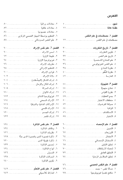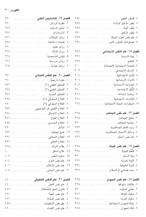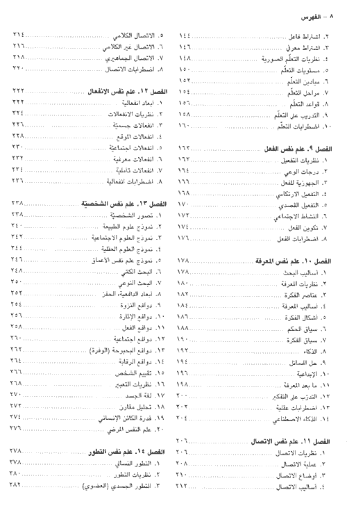 من مضمون الكتاب: المصطلحات (مسرد أبجدي لبعض مفردات علم النفس)، تاريخ النظرياتن منهجية البحث، علم الإحصاء، علم النفس العصبي والإدراك والذاكرة والتعلم والحفز والمعرفة والاتصال والانفعال وعلم نفس الشخصية والتطور والمجتمع والجماهير والبيئة والحيوان والتشخيص النفسي وعلم النفس العيادي والتطبيقي وعلم النفس الثقافة. إقرأ المزيد