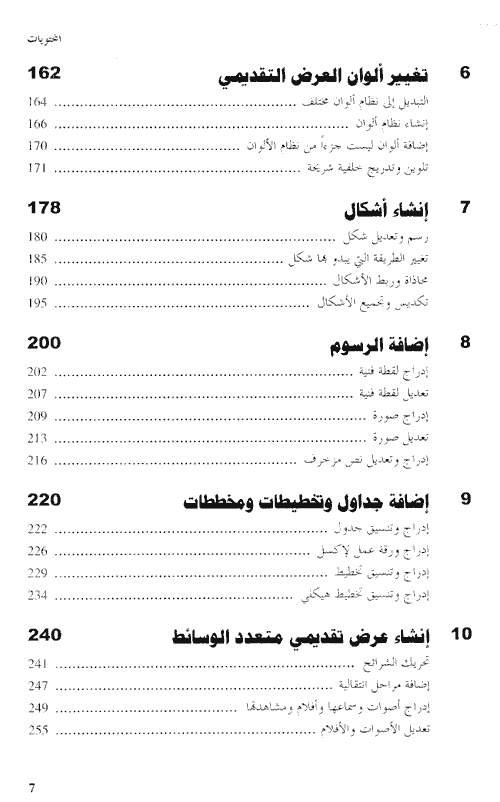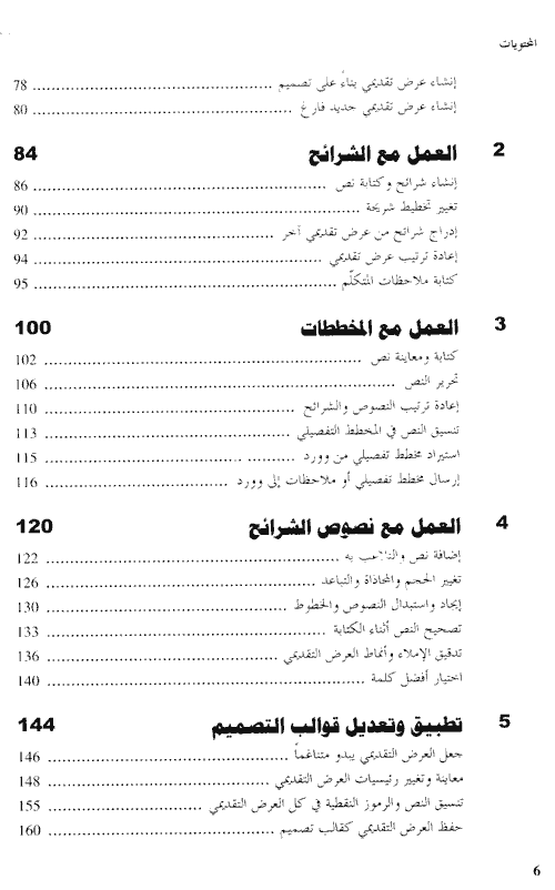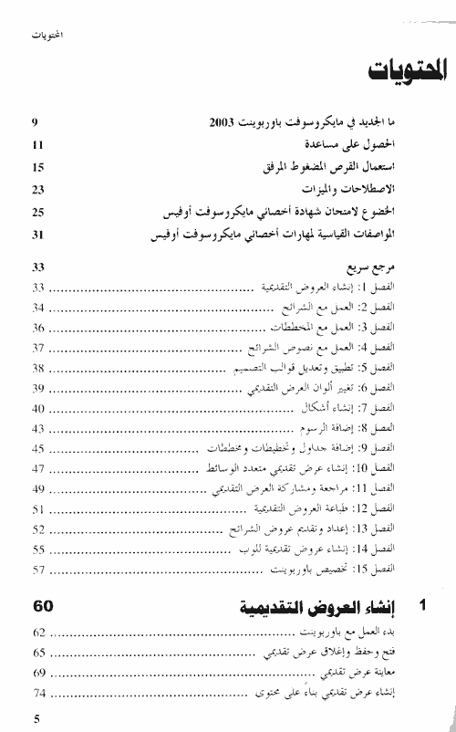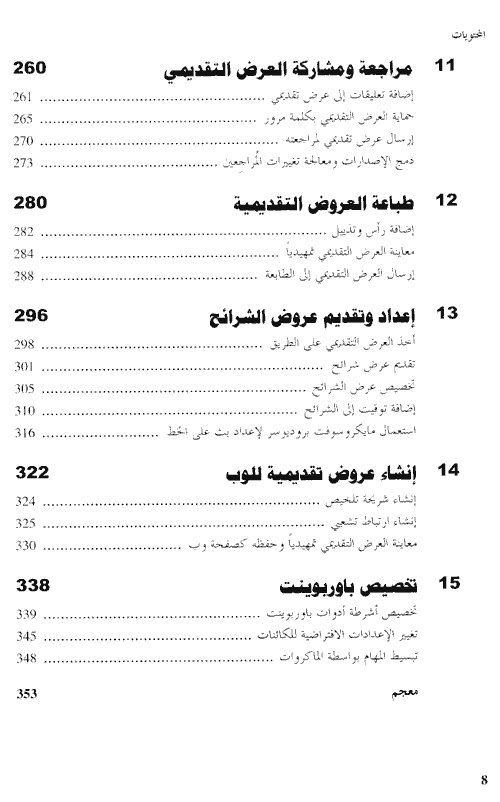 ويضم الكتاب خمسة عشر فصلاً، الفصل الأول يدور حول إنشاء العروض التقديمية إذ سيعود المستخدم على بيئة العمل في باور بوينت وسيكتشف مختلف الطرق التي يمكنه أن يعاني بها معاينة الشرائح كما سيتعلم المستخدم في الفصل الثاني كيفية إنشاء شرائح وكتابة نص أما الفصل الثالث فهو حول العمل مع المخططات ويتضمن ذلك كتابة ومعاينة النص، تحرير النص، إعادة ترتيب النص الشرائح، تنسيق النص في مخطط تفصيلي واستيراد وإرسال مخطط تفصيلي من وإلى وورد.