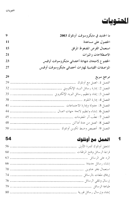 يقع الكتاب في تسعة فصول، الفصل الأول يعلمك كيفية العمل مع outlook حيث يوضح طرق إعداد outlook للعمل وكيفية كتابة وقراءة والرد على وطباعة الرسائل وإرفاق ملفات بالرسائل وفتح المرفقات. أما الفصل الثاني فهو مخصص لإدارة رسائل البريد الإلكتروني وستتعلم من خلاله كيفية تنسيق الرسائل وتغير إعدادات الرسائل وخيارات التسليم، وكيف تعاين الرسائل وإدارتها بواسطة الألوان وغير ذلك.