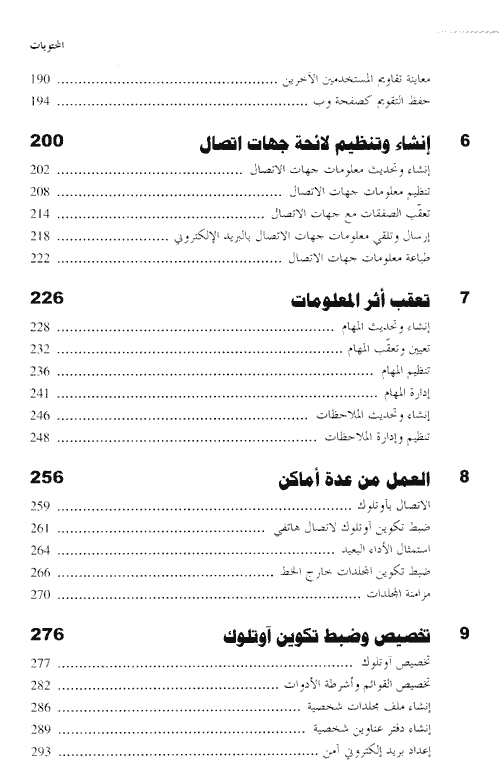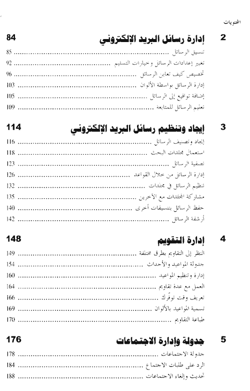ويمضي معك الفصل الخامس قدماً حيث ستتعلم كيفية جدولة وإدارة الاجتماعات والرد على طلبات الاجتماع وتحديث وإلغاء الاجتماعات ومعاينة تقاويم المستخدمين الآخرين وحفظ تقويم كصفحة وب. أما الفصل السادس فهو مخصص لتعلم إنشاء وتنظيم لائحة جهات الاتصال وتنظيم معلومات جهات الاتصال وتعقب الصفقات مع جهات الاتصال وإرسال وتلقي معلومات جهات الاتصال بالبريد الإلكتروني وطباعة معلومات جهات الاتصال.