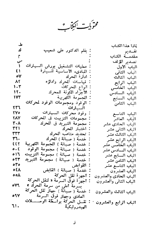 والكتاب يقع في أربعة وثلاثين باباً وهو يعرض لعمليات التشغيل بورش السيارات، ويوضح المبادئ الأساسية للسيارة وإدارة المحرك. يعرض لقياسات المحرك وأداؤه لأنواع المحركات كما يبين الأجزاء المكونة للمحرك وللمجموعة الكهربائية. ويعرض لمنظومة الوقود ومجموعات الوقود لحركات السيارات ويتناول بالشرح والتفصيل ما يتعلق بالأجهزة المساعدة للقيادة والإيقاف والإنارة وتكييف الهواء ورفع زجاج النوافذ وحفظها والقيادة التلقائية. إقرأ المزيد