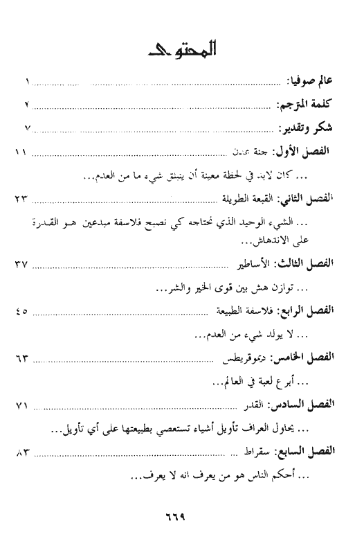 نبذة الناشر:تعود صوفيا ذات يوم من مدرستها لتجد في صندوق البريد سؤالين يقولان: من أنت؟ ومن أين جاء العالم؟