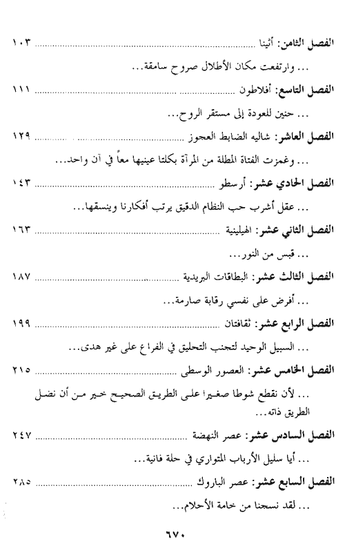 والرواية تتبع مسار ذلك الفكر في ارتباطه بالسياق التاريخي الذي تطور داخله. فهي تعرض، مثلاً، الملامح العامة للثقافة اليونانية والملامح العامة لثقافة المسيحية وكيف تصادمتا من جهة وتفاعلتا من جهة أخرى. كما تعرض لعصر النهضة وعصر الباروك والعصر الرومانسي وما كان لهذه الفترات المختلفة من تأثيرات في مجالات العمارة والفن والموسيقى. وهي تعرض أيضاً لتطور النظريات العلمية التي تركت آثارها على عالم الفكر والفلسفة مثل التصورات العلمية لجاليليو وكوبرنيك ونيوتن وداروين. وتتطرق إلى أحدث المعارف المتعلقة بنشأة الحياة ونشأة الكون. كما تتناول، علاوة على ذلك، التصورات الحديثة عن نفس الإنسان. والكتاب إذن عرض لتاريخ الحضارة الغربية ككل. إقرأ المزيد