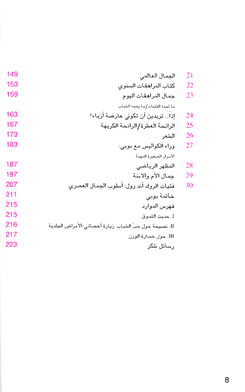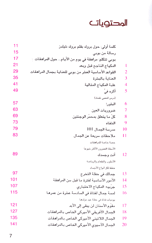 وهذه لمحة حول ما حوالت بوبي براون الحديث عنه في كتابها هذا: حول المراهقات، المكياج الناجح من قبل وبعد، العناية بالبشرة، علبة المكياج المثالية، درس لتحبي نفسك، البثور، ضروريات العين، كل ما يتعلق بمحمر الوجنتين، مدرسة الجمال (101)، الشفاه، ملاحظات سريعة عن الجمال، أنت وجسدك (الأسلوب والطعام والرياضة، خطط لكل أنواع الأجسام)، جمالك في حفلة التخرج، الأمور الاساسية لفترة ما قبل سن المراهقة، جربي المكياج الاختباري، لمسة جمال لفتاة في السادسة عشرة من عمرها، (يوميات فتاة في عيد مولدها)، مقوّم الأسنان، الجمال الإفريقي الأميركي الخاص بالمراهقات، الجمال اللاتيني الأميركي الخاص بالمراهقات، الجمال الآسيوي الأميركي الخاص بالمراهقات، الجمال العالمي، كتاب المراهقات السنوي، جمال المراهقات اليوم (ما تحبه الفتيات، ما يحبه الشباب)، تريدين أن تكوني عارضة أزياء، الرائحة العطرة/الرائحة الكريهة، الشعر، وراء الكواليس مع بوبي، المظهر الرياضي، جمال الأم والإبنة، فتيات الروك أند رول: أسلوب الجمال العصري، نصيحة حول حب الشباب، حول خسارة الوزن. وتجدر الإشارة بأن المؤلفة أغنت كتابها بالصور الموضحة التي تظهر الكيفية التي تتم بها عملية المكياج، وبصور معبرة عن المواضيع المطروحة خلال سياق الكتاب. إقرأ المزيد