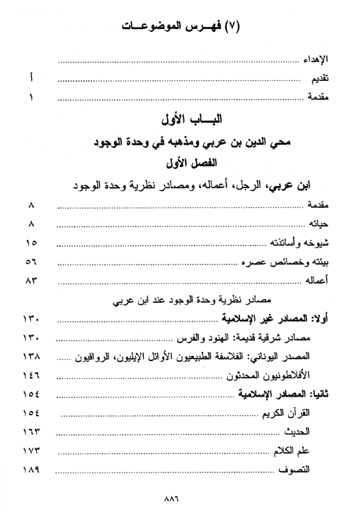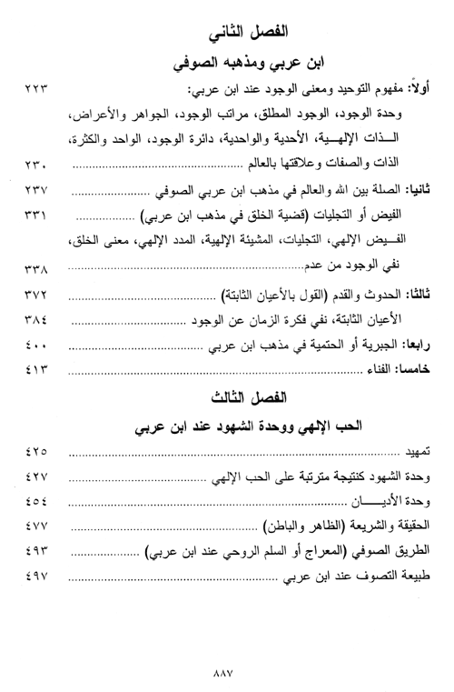 تقع تلك الدراسة في بابين الأول خصصته للحديث عن مذهب وحدة الوجود عند ابن عربي ويشتمل على ثلاثة فصول: الفصل الأول عرضت في لحياة ابن عربي، أعماله تلامذته، ومصادر فلسفته التي تنوعت من مصادر غير إسلامية إلى مصادر أخرى إسلامية. وقد تناولت في الفصل الثاني مذهب ابن عربي الصوفي من خلال حديثها عن أفكار الجوهر والأعراض، دائرة الوجود، الذات الإلهية وعلاقتها بالصفات من جهة، وبالعالم من جهة أخرى، والصلة بين الله والعالم، والتفرقة بين مصطلحي القدم والحدوث. أما الفصل الثالث فقد عرضت فيه لفكرة الحب الإلهي ووحدة الشهود في مذهب ابن عربي وذلك من خلال تناولهما لمفهوم الحقيقة والشريعة، وفكرة المعراج أو السلم الروحي.