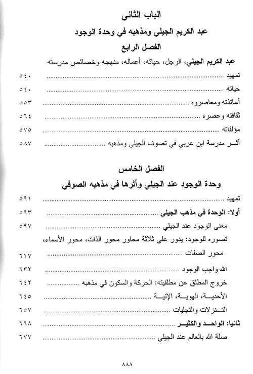 أما الباب الثاني من تلك الدراسة فقد تناولت فيه الباحثة مذهب الجيلي الصوفي من خلال أربعة فصول: في الفصل الرابع عرضت لحياة الجيلي، مدرسته، شيوخه، تلامذته، وطبيعة عصره، كما ناقشت مذهب وحده الوجود ومدى الاتفاق والاختلاف بين ابن عربي والجيلي بصدد فكرة الوجود وأوضحت موقف الجيلي من العلاقة بين الله والعالم وذلك في الفصل الخامس.
