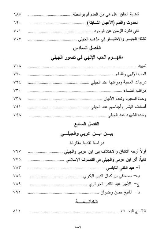 وانتقلت في الفصل السادس إلى الحديث عن فكرة الحب الإلهي عند الجيلي واقتضى ذلك التفرقة بين فكرة الغناء عند المتصوفة، وفكرة الزفانا الهندية وانتهت إلى أن الجيلي يقول بوحدة شهود كنتيجة للحب الإلهي والتجربة الروحية، ويجيء الفصل السابع والأخير وهو بمثابة دراسة نقدية مقارنة بين ابن عربي والجيلي، وأوضحت فيه أثرهما في التصوف الإسلامي وبخاصة عند النابلسي، البكري، والجزائري، وقد افتتحت الباحثة تلك الدراسة بإبراز أهم النتائج التي توصلت إليها مستخدمة في ذلك منهجاً تاريخياً وتحليلياً نقدياً فكرياً. إقرأ المزيد