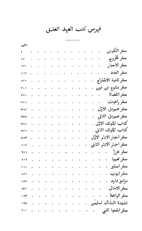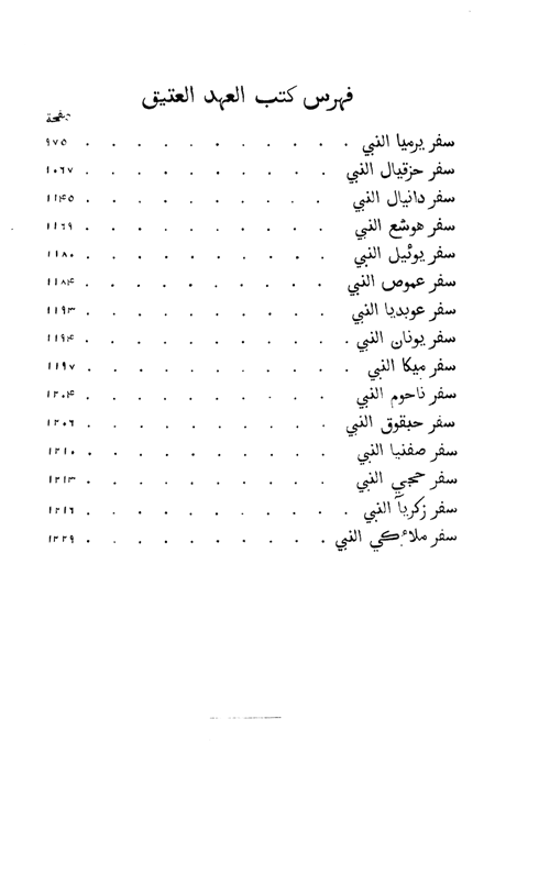 والتي هي: سفر التكوين، سفر الخروج، سفر الأحبار، سفر العدد، سفر تثنية الاشتراع، سفر يشوع بن نون، سفر القضاء، سفر راعوث، سفر صموئيل الأول، سفر صموئيل الثاني، كتاب الملوك الأول، كتاب الملوك الثاني، سفر أخبار الأيام الأول، سفر أخبار الأيام الثاني، سفر عزرا، سفر نحميا، سفر إستير، سفر أيوب، مزامير داود، سفر الأمثال، سفر الواعظ، نشيدة النشائد لسليمان، سفر أشعيا النبي، سفر يرميا النبي، سفر حزقيال النبي، سفر هوشع النبي، سفر يوئيل النبي، سفر عموص النبي، سفر عوبديا النبي، سفر يونان النبي، سفر ميكا النبي، سفر ناحوم النبي، سفر حبقوق النبي، سفر حجي النبي... إقرأ المزيد
