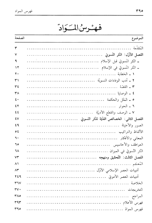 وفي التمهيد الثاني بينت أهمية النثر النسوي.. وفي التمهيد الثالث بينت بلاغة المرأة ومكانة النثر النسوي في هذه الحقبة من الزمن. ولم أستطع الاختصار أكثر مما اختصرت نظراً لأهمية تلك الأقوال المأثورة عن الخلفاء والقادة. ثم ابتدأت الباب الأول من هذه الرسالة وفيه فصلان، كأن أولهما، الفنون النثرية النسوية وأنواعها، وهي: الخطابة، وأدب الوافدات، والقصة، والوصايا، والمثل، والحكمة، والحوار، والوصف، والقطع الأدبية.