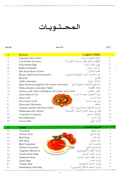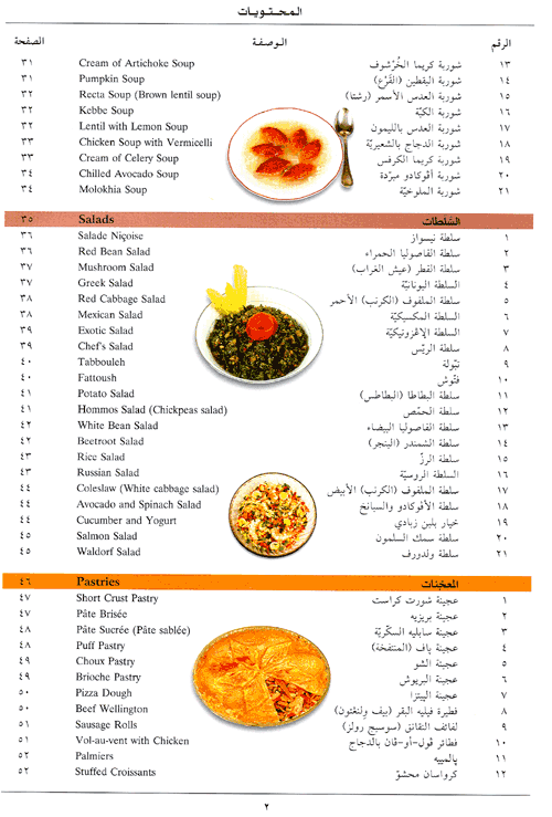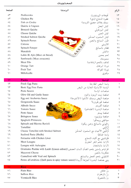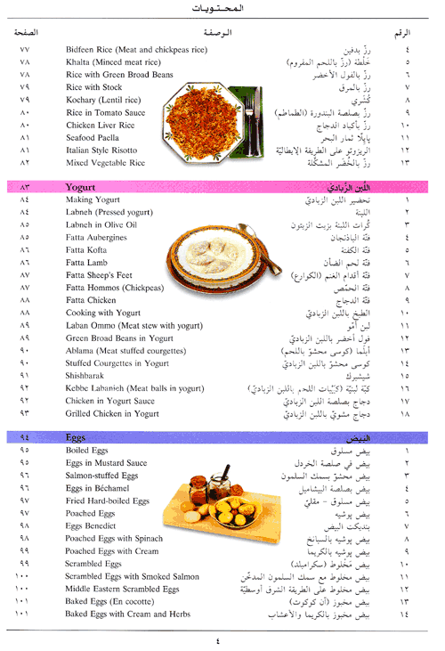 إضافة إلى ذلك هناك في الكتاب فصل خاص بالوجبات السريعة السهلة الإعداد والتي لا يتطلب تحضيرها جهداً أو وقتاً طويلاً؛ وقد أرفق كل ذلك بفصل خاص بالصلصات التي تضاف عادة إلى الطعام أو تضاف إليه عند الأكل، فتكسبه غنىً ومذاقاً فريدين، وكثيراً ما كان يلي الوصفات نصائح للتنبيه إلى ما يمكن أن يسيء إلى مذاق الطبق. أو للإرشاد إلى كريقة تحضير معينة لتأتي بالنتيجة الممتازة.