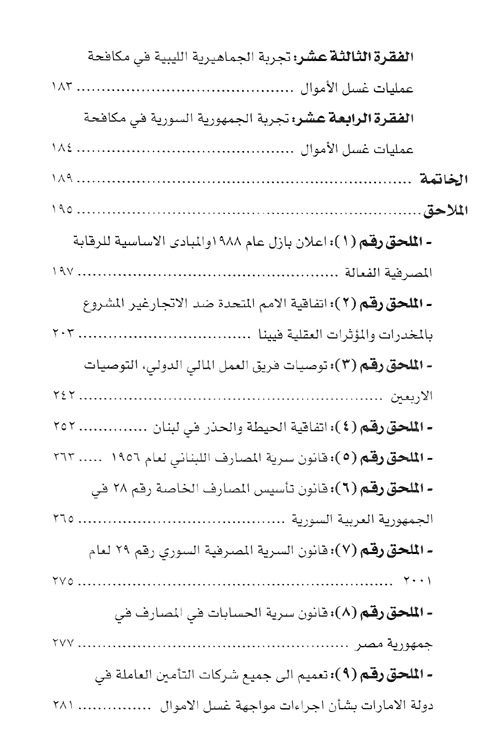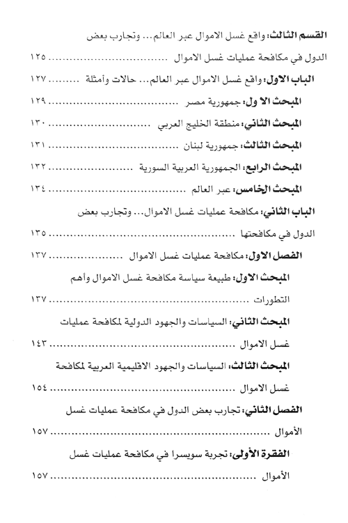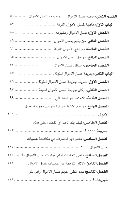 وقد اختارت المؤلفة أن تضع هذه الدراسة في ثلاثة أقسام وخاتمة. القسم الأول يتضمن التعريف بالمصاريف والقانون المصريفي وعملياته، كما بينت ماهية السرية المصرفية رفع السرية المصرفية وعقوبتها. أما القسم الثاني فقد خصصه لبحث في ماهية غسيل الأموال وجريمة غسيل الأموال كما عرضت لمراحل غسل الأموال ووسائل ذلك مبنية جرائم غسل الأموال وعقوبتها ومن هم الأشخاص المقصودين بجريمة التبييض وكيف يمكن الحد من والقضاء على جريمة غسل الأموال وما هي الآثار الناجمة عن عمليات غسيل الأموال، ومدى تطور حجم غسيل الأموال. وتناولت في القسم الثالث من الكتاب واقع غسيل الأموال عبر العالم وتجارب بعض الدول في مكافحته، وقد توصلت المؤلفة إلى أن موضوع تبييض الأموال يخالف المفاهيم الدينية والإنسانية والأخلاقية. إقرأ المزيد