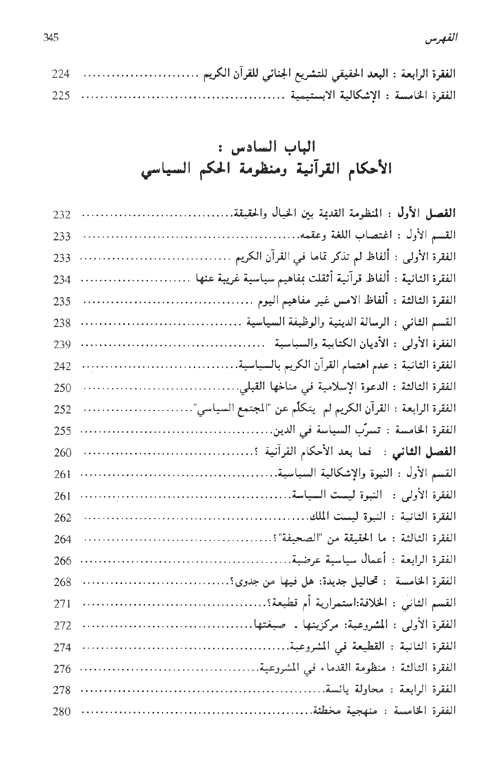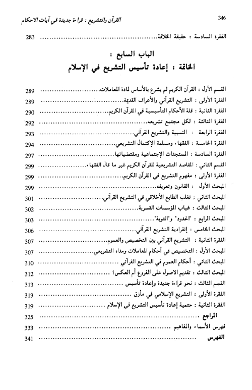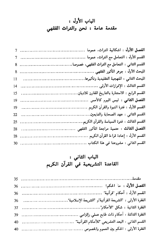 ومن الواضح بأن ما سيحاول المؤلف بيانه في هذه الدراسة هو، نقيض المنظومة التقليدية، في محتواها، أي في مقاربتها بين "الشريعة القرآنية" من جهة، و"الشريعة الإسلامية" من جهة أخرى. فإن إعادة قراءة الكتاب العزيز بالتركيز على أحكامه التشريعية الخاصة بالمعاملات، وهي محل اهتمام المؤلف في هذا الكتاب، تدل أنه، على خلاف ما قال به الفقهاء القدامى: 1-ليس من الصحيح الادّعاء أن "القرآن فيه بيان كل شيء" في ميدان المعاملات، 2-ليس من الصحيح الادعاء أن في ما جاء من تشريعات قرآنية، "تعريف القرآن بالأحكام الشرعية أكثر كليّ لا جزئي"، وأن القرآن على اختصاره جامع، ولا يكون جامعاً إلا والمجموع فيه أمور كليات. فإن من أبرز خصائص الأحكام القرآنية في معظمها، هي أنها محددة بشخص أو بظرف أو بزمن، أو بسبب للنزول، يكون مفعولها حصر مفعول ذلك الحكم بصفة مباشرة أو غير مباشرة. 3-أما إذا فهمت "الكليات" في معنى أوسع لتغطي ما سماه الشاطبي نفسه بالضروريات والحاجيات والتحسينات ومكمّل كل واحد منها، فإن الادّعاء الوارد عند الفقهاء القدامى أن "القرآن قد تضمنها على الكمال"، هو أقل قوة مما سبق من دفعات، ذلك أن أغلب ما جاء من تشريعات في القرآن الكريم، مركز على التخصيص في محتوى الحكم، أي على الأجزاء. 4-وإن كان ما سبق يهم المحتوى الموضوعي للنص القرآني، كما يذكر المؤلف، فإن المنظومة التقليدية تثير اعتراضات خطيرة من حيث فهمها وتفسيرها للأحكام القرآنية، والمؤلف ينبه القارئ إلى أن اهتمامه في دراسته هذه ينحصر في محتوى هذه لهذه التفاسير، ولا يتعرض إلى الاسلوب والمنهجية، لأن ذلك وجه من المسألة يتطلب دراسة معمقة خاصة به نظراً إلى الأهمية البالغة. فإذا تم النظر من هذه الزاوية إلى المحتوى للأحكام القرآنية، فإنه، وكما يقول المؤلف، سيلاحظ بوناً شاسعاً بين ما يدّعيه الفقهاء القدامى من احترام مطلق، وتقيد يقظ بالنص القرآني من جهة، وحقيقة تعاملهم مع الأحكام والتشريعات التي جاء بها القرآن الكريم من جهة أخرى.