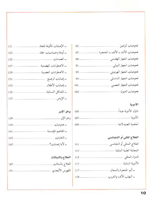 وهذه لمحة عن المحاور التي تناولها هذا الكتاب: الإسعافات الأولية، الطب، الجراحة، الفحوصات، الأدوية، العلاج المثلي أو التجانسي، وخز الإبر، العلاج بالنباتات. من هنا يمكن القول بأنه وبفضل هذه الموسوعة للصحة العائلية يستطيع الفرد أن يصبح أكثر استعداداً لأن يلعب دور المحاور العارف تجاه طبيبه، وهكذا تنشأ علاقة واعية بين الطبيب والمريض مرتكزة على قيم التفسير والوضوح، وهذا يؤدي إلى مزيد من الفعالية في معالجة الحالات المرضية لأي شخص. إقرأ المزيد