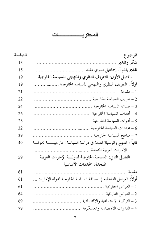 يبدأ الكتاب بتقديم إطار نظري تمهيدي للسياسة الخارجية يتضمن تعريفاً بطبيعتها وأهدافها، وأدواتها، ومحدداتها، والمناهج المستخدمة في دراستها، ومن هذا التقديم النظري، ينطلق المؤلف إلى تحليل مجموعة المحددات الرئيسية التي تؤثر في تشكيل المضمون الأساسي لسياسة دولة الإمارات الخارجية.