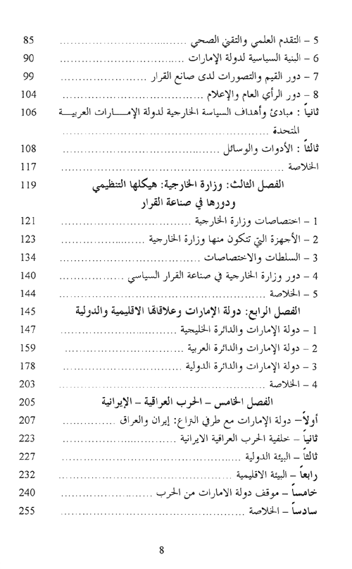 وضمن هذا السياق المترابط من العرض والتحليل، يقوم المؤلف برسم صورة شاملة للجهاز الرئيسي المنوط به رسم تلك السياسية الخارجية وبلورة أهدافها وتحديد مرتكزاتها والذي يقع عليه أيضاً عبء إدارتها تمكيناً لها من بلوغ غاياتها المنشودة ونعني بذلك وزارة الخارجية بدولة الإمارات. ويتبع ذلك الفصل الذي يفرده المؤلف لتحليل العلاقات الإقليمية والدولية لدولة الإمارات وقد تطرق العرض إلى العديد من القضايا الرئيسية الهامة التي كان لدولة الإمارات دور فاعل فيها، وقد جاء العرض منسقاً ومعبراً عما أراد المؤلف توضيحه والتأكيد عليه.