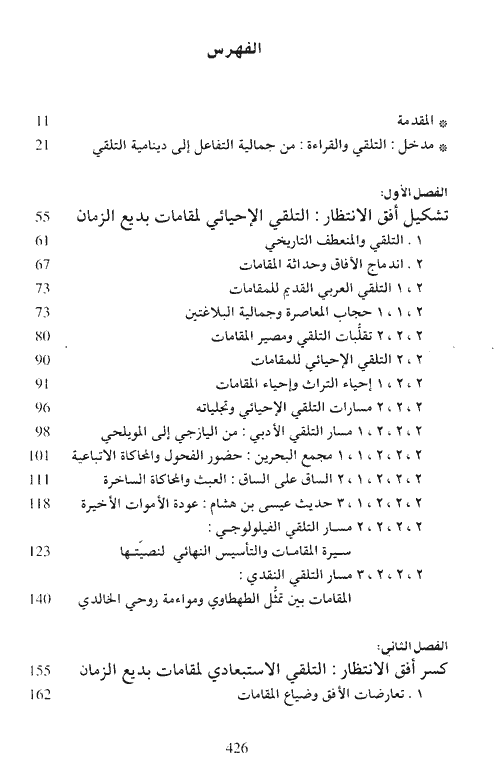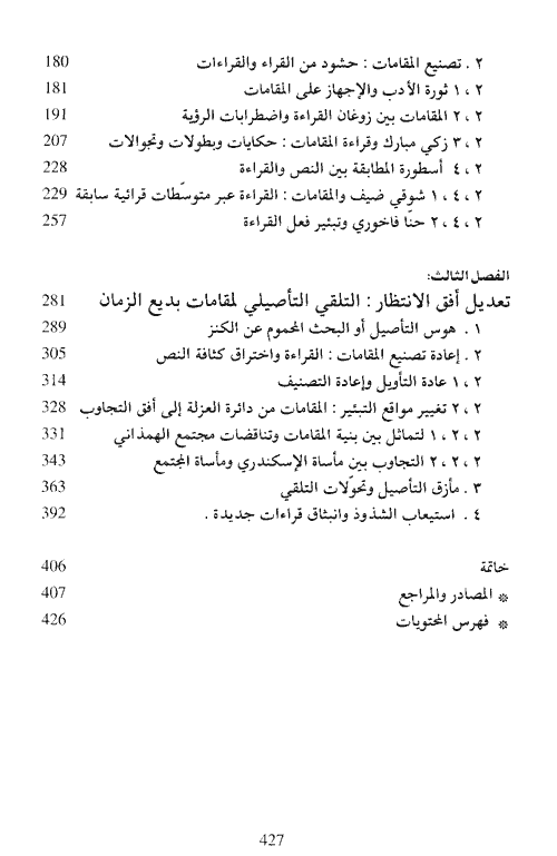 أما الفصل الثاني وعنوانه "كسر أفق الانتظار: التلقي الاستبعادي لمقامات بديع الزمان" فقد دار حول نمط التلقي الاستبعادي الذي يمثل حالة انقطاع شبه جذرية عن نمط التلقي الإحيائي الذي كان عرضة للمعارضة والتشويش على ذوقه ومعاييره الجمالية وأعرافه القرائية بصورة عنيفة نادرو الحدوث في تاريخ التلقي العربي الحديث. وأما الفصل الثالث: وعنوانه "تعديل أفق الانتظار: التلقي التأصيلي لمقامات بديع الزمان"، فإنه يتوقف عند نمط التلقي التأصيلي، وأثره في إعادة الاعتبار للمقامات، وفي تعديل أو تصحيح أفق الانتظار الذي تعرض للكسر والتحطيم مع نمط التلقي الاستبعادي السابق، حيث المقامات هنا يعاد تصنيعها من جديد، وبصورة تتناسب مع أفق أولئك القراء الذين كانوا يقرأون المقامات وهم مدفوعون برغبة شديدة في الانتصار لها وللتراث العربي وللذات العربية. إقرأ المزيد