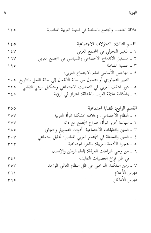 وضمن القسم الثاني مقالات تعالج مسائل الاغتراب، والثورة والمجتمع المدني. وركز في القسم الثالث على تحليل واقع التحولات الاجتماعية بما فيها مسائل التنمية، والتغير التجاوزي، ودور المثقف المبدع في هذا المجال، وإشكالية علاقة العرب بالحداثة. أما القسم الرابع والأخير فضمنه مقالات تتعلق بمعالجة قضايا اجتماعية كمشكلة تحرير المرأة العربية وعلاقة الدين بالسلطة والطبقات الاجتماعية، ومسالة هجرة الأدفعة العربية كظاهرة اجتماعية، ودور النزاعات العرقية في إلغاء الوطن والإنسان معاً، وأزمة التفكك الداخلي في ظل النظام العالمي الواحد.نبذة الناشر:إن الأزمة التي نعاني منها قبل غيرها هي أزمة منهج في التفكير. وإذا كان لهذه المقالات التحليلية النقدية، ثقافية كانت أو اجتماعية، من أهمية فأنها واحدة من المساهمات الفكرية باتجاه العمل على التغلب على الأزمات التي يعاني منها المجتمع. من هذا المنظور نعتبر أن الصراع في كافة جوانبه لن يتوقف، ولا بد أن يتخذ أشكالاً جديدة نخرج من حالة العجز التي نعيشها ونعايشها كما لو كانت جزءاً من حياتنا اليومية. بذلك فقط يكون معنى لنهاية قرن وبدء قرن جديد. لقد بدأ قرن آخر، ولم نبدأ نحن. إقرأ المزيد