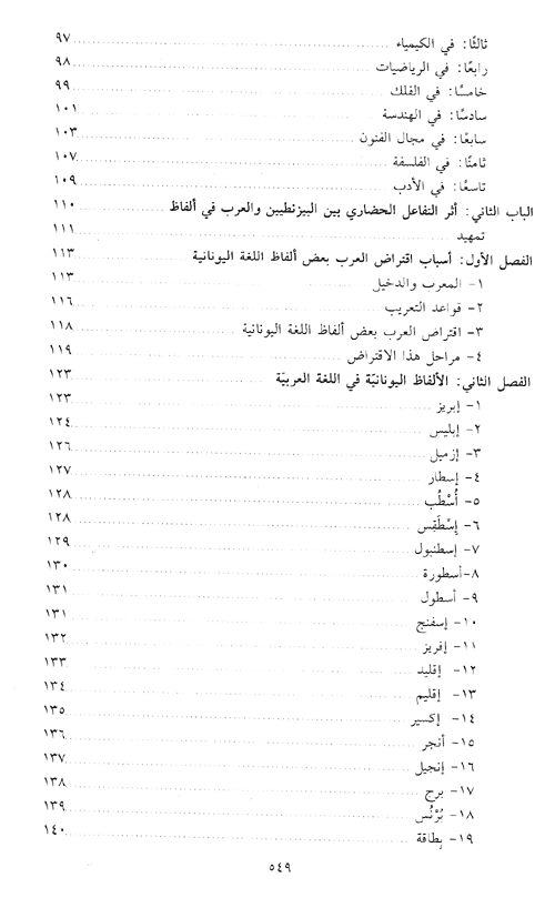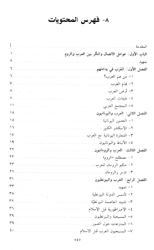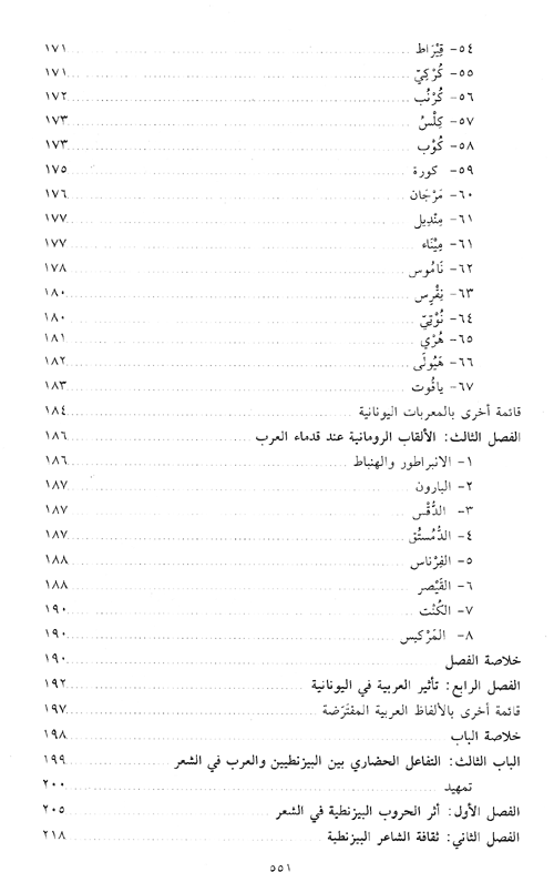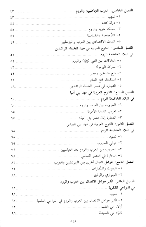 كما عرض في الباب الأول لعوامل الاتصال والتأثير بين العرب والروم، فعرف بالعرب وطبقاتهم وهجراتهم ودويلاتهم ودياناتهم. كما يبحث في تاريخ العلاقات منذ بواكير الصلات بين الطرفين. كما يبحث أثر التفاعل الحضاري بين البيزنطيين والعربي في الألفاظ ويحاول أن يبرز وجوه واقتباس كل لغة من الأخرى مجموعة من الألفاظ والاصطلاحات والألقاب قبل أن يناقش المؤثرات البيزنطية واليونانية في الأدب العربي.