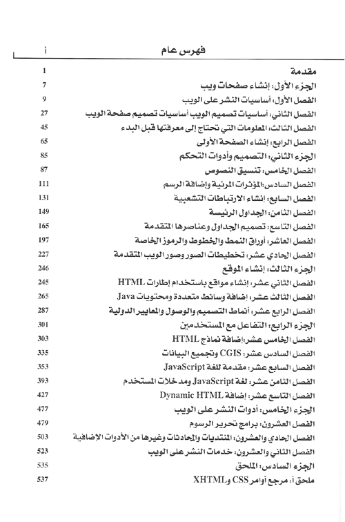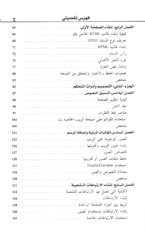 الجزء الخامس: أدوات النشر على الويب: يركز الجزء الأخير من هذا الكتاب على البرامج والخدمات التي يمكنك استخدامها لتوسيط خبرة نشر الويب. يوضح الفصل العشرون بعض حزم برامج تأليف الويب الرسومية. أما الفصل الحادي والعشرون، فيركز على أدوات تقوية ملقم الويب، وهي برامج التعليمات، وغيرها من البرامج التي يمكنك استخدامها لإضافة عداد صفحات ومنتديات تفاعلية وغرف محادثة. ينتهي الفصل الثاني والعشرون بنظرة على بعض حلول ملقمات الويب المختلفة، بما في ذلك ملقمات الويب المجانية والشركات التي توفر حلول التجارة الإلكترونية.