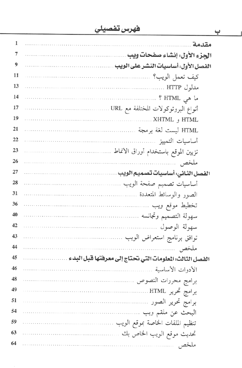 الجزء الأول: إنشاء صفحات ويب: في هذا الجزء سوف تحصل مقدمة للمفاهيم ...والمصطلحات التي تراها في ثنايا هذا الكتاب، بنما في ذلك الانترنت والويب وHTML وXHTML وأوراق النمط وJavaScript وغيرها. يوفر لك الفصل الثاني تمهيداً لمبادئ تصميم الويب، بينما يتناول الفصل الثالث الأدوات المطلوبة قبل البدء في التأليف للويب (وهي محررات النصوص وتطبيقات التعامل مع الرسوم). ينتهي هذا الجزء بالفصل الرابع، وفيه يتم إنشاء صفحة ويب نموذجية وقالب لما يليه من صفحات.