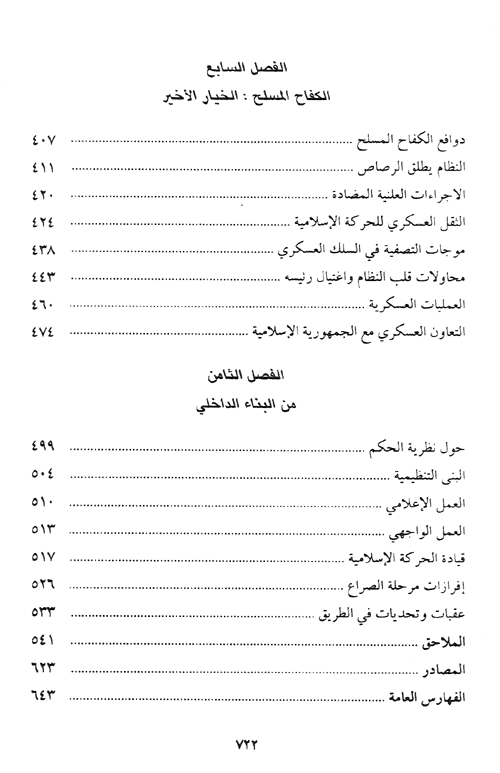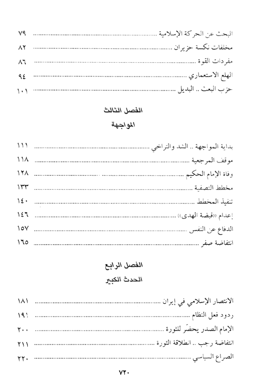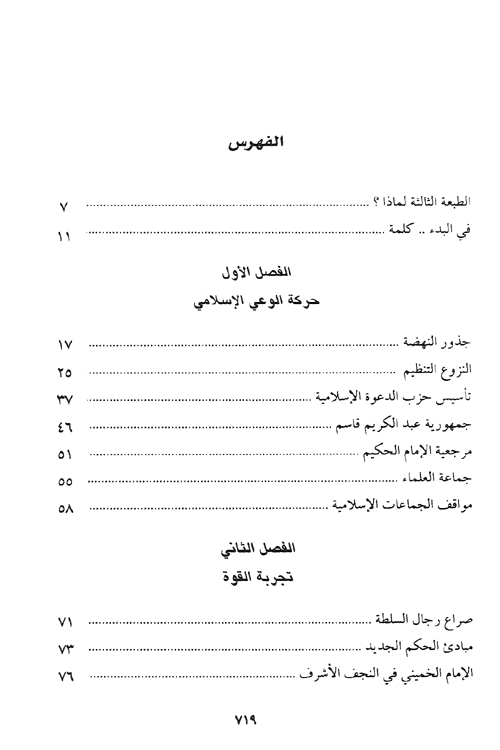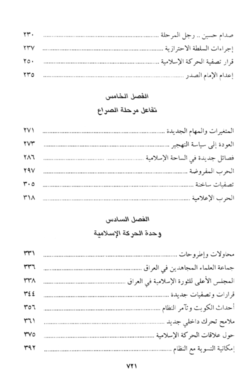 ينقسم الكتاب إلى ثمانية فصول، يمثل كل منها مرحلة تاريخية تمثل منعطفاً يميز واقع الحركة الإسلامية خصوصاً والواقع العراقي عموماً. حمل الفصل الأول عنوان: جذور النهضة، حيث يستعرض الواقع السياسي العراقي منذ دخول البريطانيين العراق عام 1914 ثم يركز على تأسيس الحركات الأبرز كجماعة الإخوان المسلمين وحزب التحرير وحزب الدعوة الإسلامية وجماعة العلماء، إضافة إلى تحرك مرجعية السيد محسن الحكيم، وحكم عبد الكريم قاسم، والمد الشيوعي. ودرس الفصل الثاني تجربة القوة التي مر بها الإسلاميون خلال العهد الطائفي القومي لحكم عبد السلام عارف وعبد الرحمن عارف، هذه التجربة التي كانت تؤهلهم للقفز إلى السلطة لولا عودة حزب البعث إلى السلطة وإجراءاته العنيفة الشاملة التي دمرت كثيراً مما بناه الإسلاميون، وهو ما يعرضه الفصل الثالث، فيما يخصص الفصل الرابع لدراسة المنعطف الأخطر الذي نقل الإسلاميين إلى مرحلة جديدة والمتمثل بحدث الثورة الإسلامية الإيرانية واستلام صدام حسين السلطة خلفاً لأحمد حسن البكر والوضع الإقليمي الجديد، ثم دخول الإسلاميين ولا سيما حزب الدعوة في مواجهة عسكرية متواصلة مع السلطة وما تخللها من إعدام السيد محمد باقر الصدر الذي قام الحركة الإسلامية العراقية سنوات طويلة. وحمل الفصل الخامس عنوان: تفاعل مرحلة الصراع، والتي اتسمت بالدموية والسرعة الفائقة في التطورات وظهور حركات ورموز جديدة. ويدرس الفصل السادس موضوع وحدة الحركة الإسلامية بعد تعدد فصائلها ورموزها وتوسع مساحتها، فظهرت عدة مشاريع أهمها المجلس الأعلى للثورة الإسلامية. وعرض الفصل السابع بالأرقام والتحليل موضوع تبني الإسلاميين العراقيين لخيار الكفاح المسلح للرد على ممارسات السلطة، ومن ذلك خمس محاولات انقلابية قاموا بها وأكثر من عشر محاولات لاغتيال صدام حسين، ثم اشتراكهم في حرب الثماني سنوات إلى جانب القوات الإيرانية، ويدرس الفصل الثامن قضايا لها علاقة بالبناء الداخلي للحركات الإسلامية، كالرأي الفقهي في نظام الحكم، وأهم الرموز القيادية للإسلاميين، ونشاطهم الإعلامي ومنظامتهم الواجهية. وبعد نهاية الفصول تم وضع 14 ملحق ووثيقة، منها ملحق إحصائي عن التركيبة السكانية والقوميات والطوائف في العراق. إقرأ المزيد
