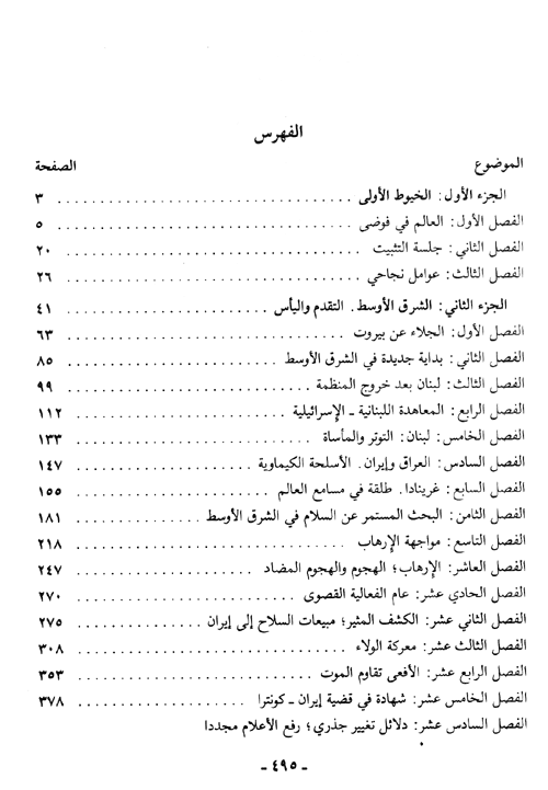 لمحة شاملة قدمها جورج شولتز ليمضي القارئ في تتبع مذكراته التي حوت الكثير من الأحداث المهمة وكشفت عن تلك الخلفيات لاستراتيجيات السياسة الأمريكية. يتحدث شولتز في بداية مذكراته عن حال العالم الواقع في فوضى متنقلاً من ثم للحديث عن وقائع الجلسة التثبيتة له كفاعل في السياسة الخارجية للبيت الأبيض الأمريكي ومن ثم يكشف وفي الجزء الثاني من هذه المذكرات عن الأحداث التي وقعت في منطقة الشرق الأوسط وبالتحديد في لبنان والعراق وإيران إبان عهده كوزير للخارجية الأمريكية، ومتحدثاً بإسهاب عن السياسة الأمريكية تجاه عملية السلام التي أخذت حيزها التاريخي من تلك الآونة. مذكرات تحظى بالاهتمام على جميع الأصعدة لما تحمله من حقائق وخفايا وتفاصيل تلك الوقائع التي كان للسياسة الأمريكية أثرها الفعال فيها. إقرأ المزيد