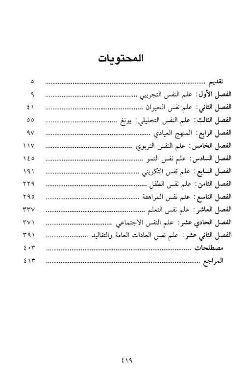 وفي فصول الكتاب المتلاحقة يجد القارئ والباحث والدارس على حد سواء عرضاً مفصلاً لعلم النفس التجريبي الذي يحاول صياغة قوانين السلوك الإنساني، وعلم نفس النمو الذي يبحث في مراحل النمو المختلفة التي يمر بها الإنسان إضافة إلى علم النفس الوظائفي (الفيزيولوجي) الذي يبحث العلاقة المتبادلة بين التغيرات الوظيفية في جسم المؤلفان فصلاً موسعاً لعلم النفس الاجتماعية الذي يعني بدراسة السلوك الإنساني داخل المجتمع ويبحث في مدى تأثر هذا السلوك بالمواقف الاجتماعية والمنبهات القادمة من المجتمع.